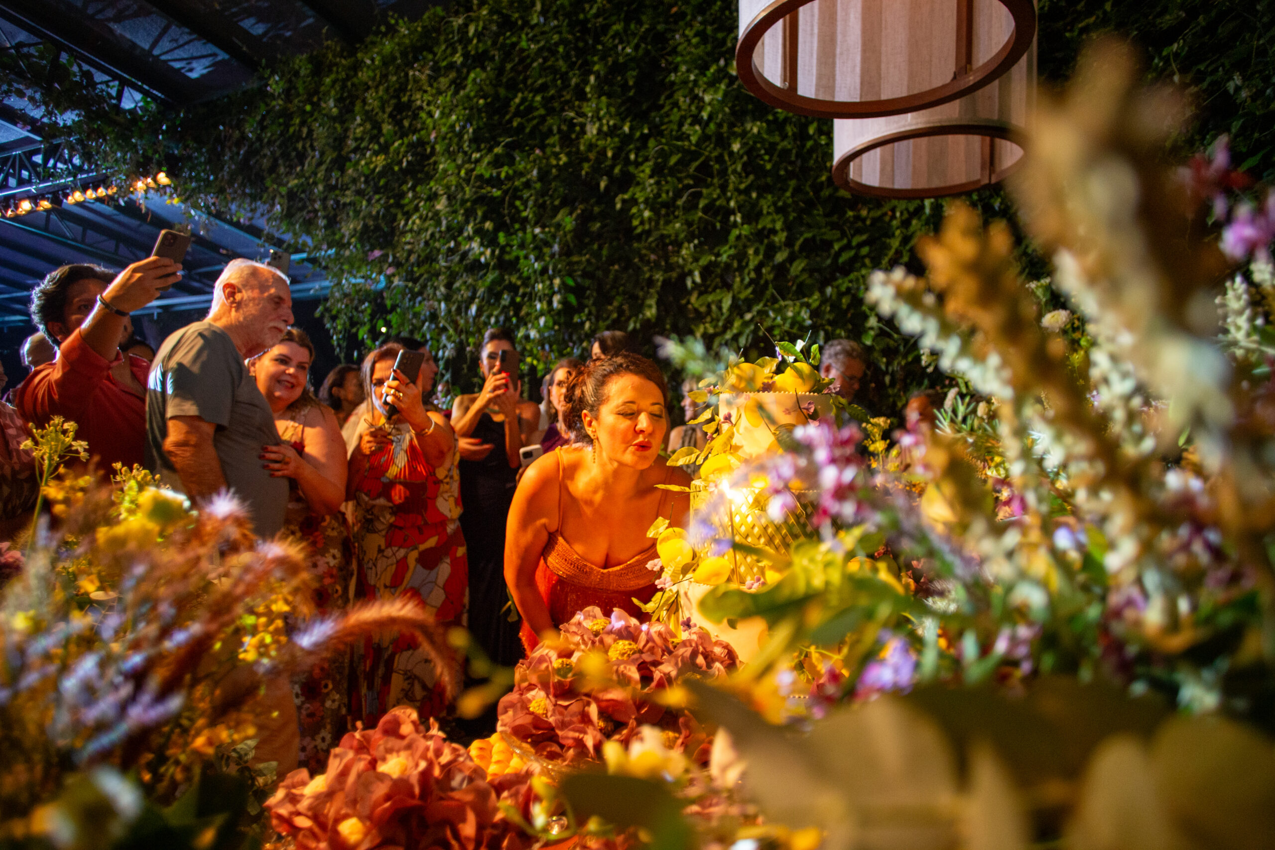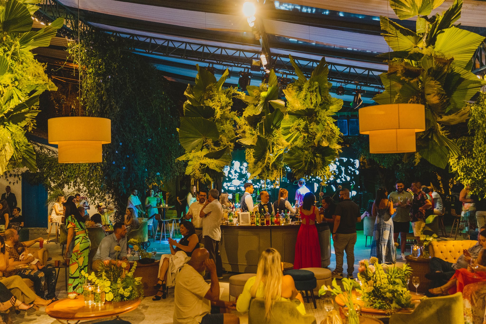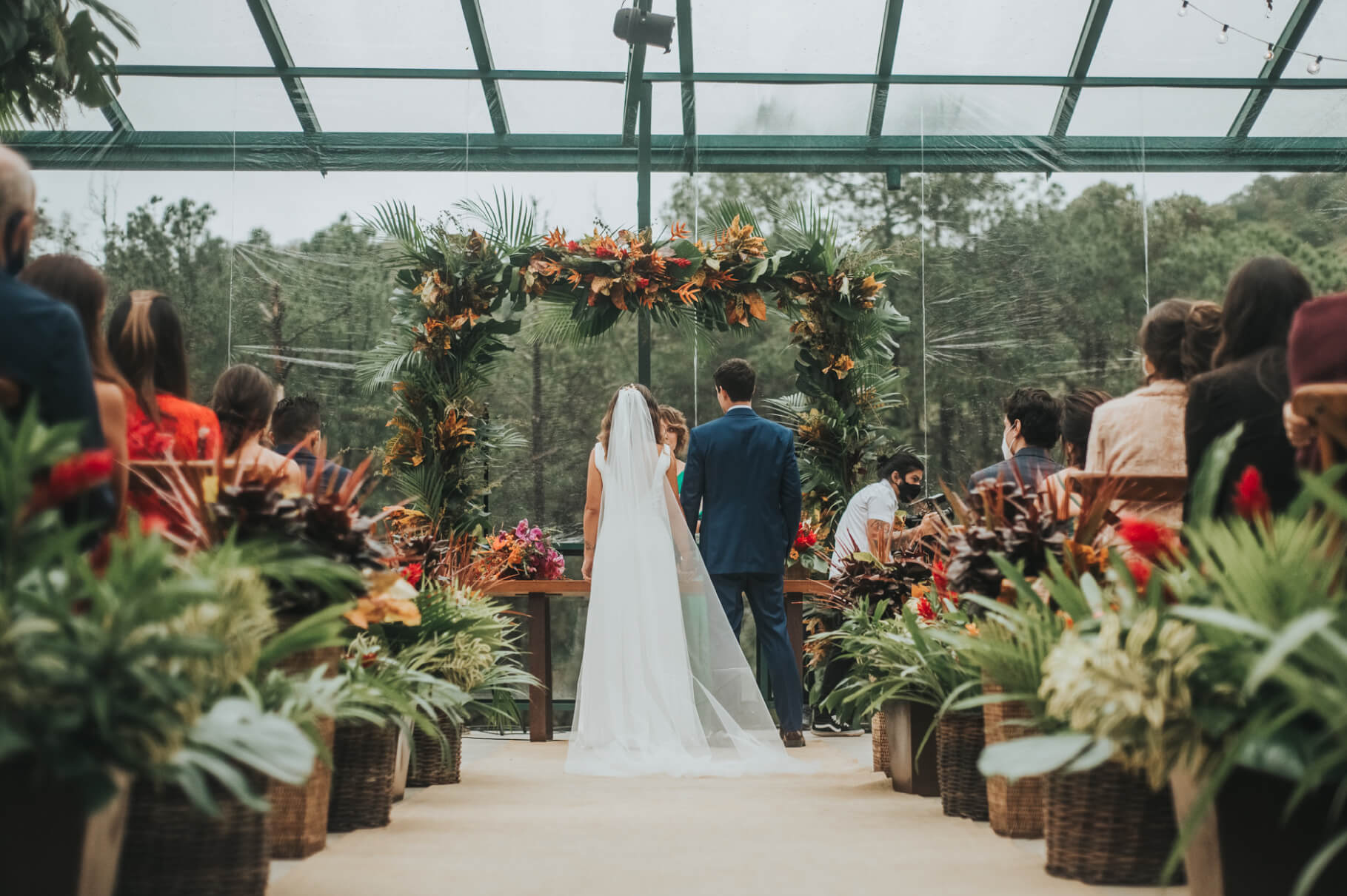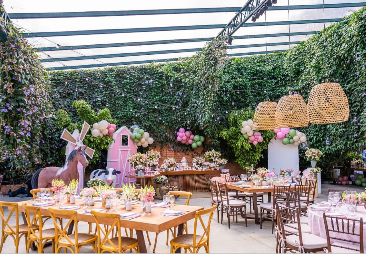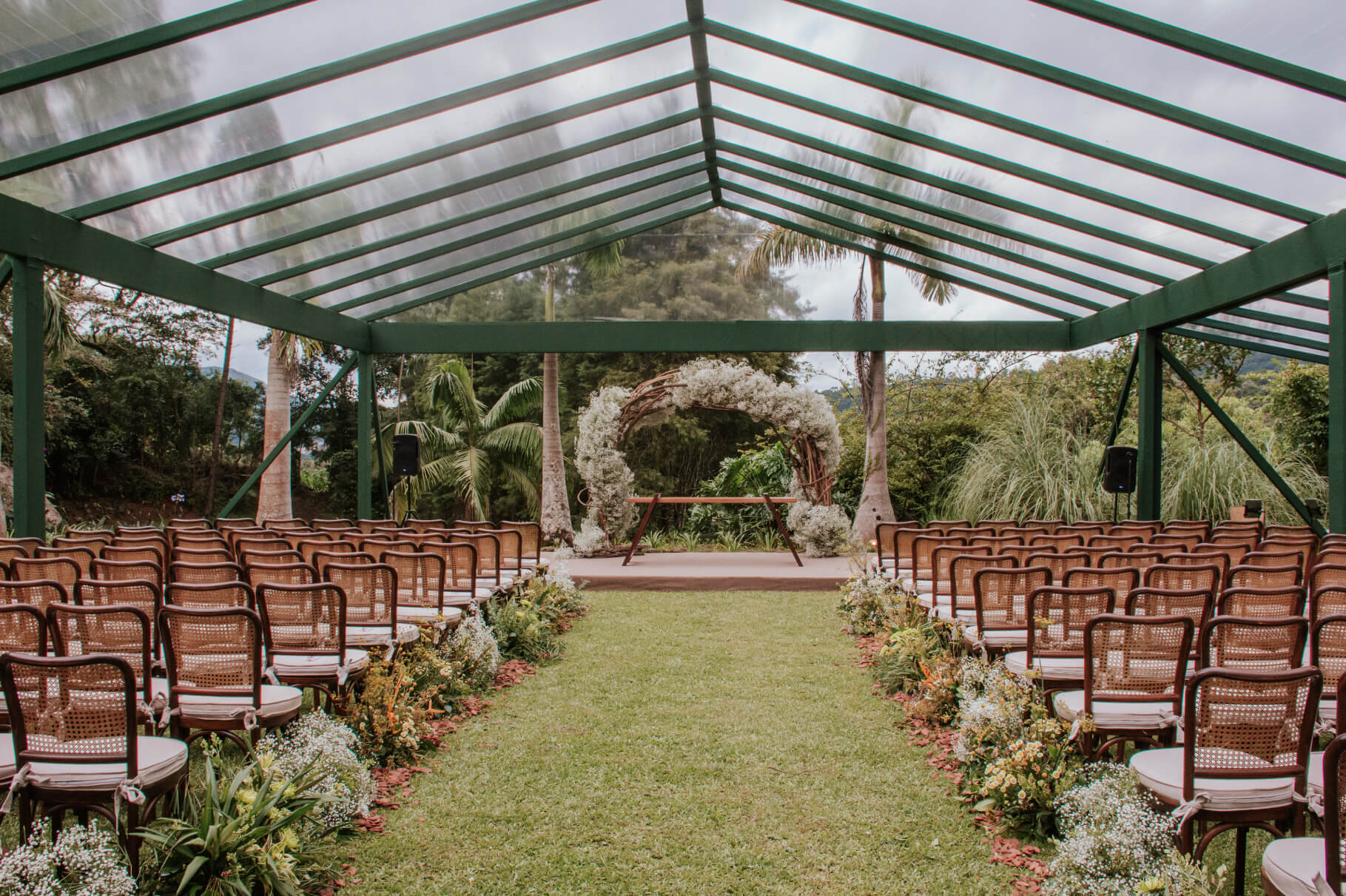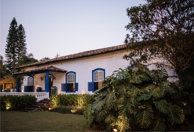 Nosso salão de festas conta com aproximadamente 550m², pé direito de 7m em declive e cobertura transparente fixa que integra o salão com a natureza do local e a Casa Sede.